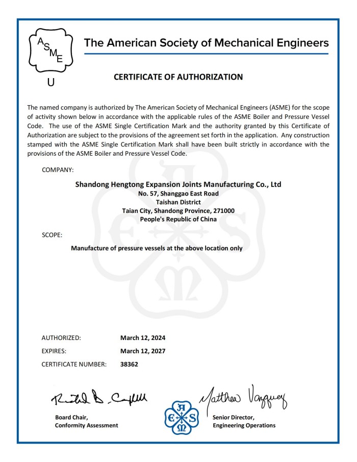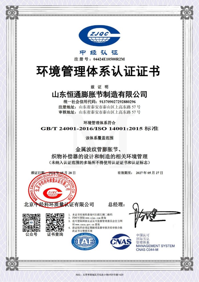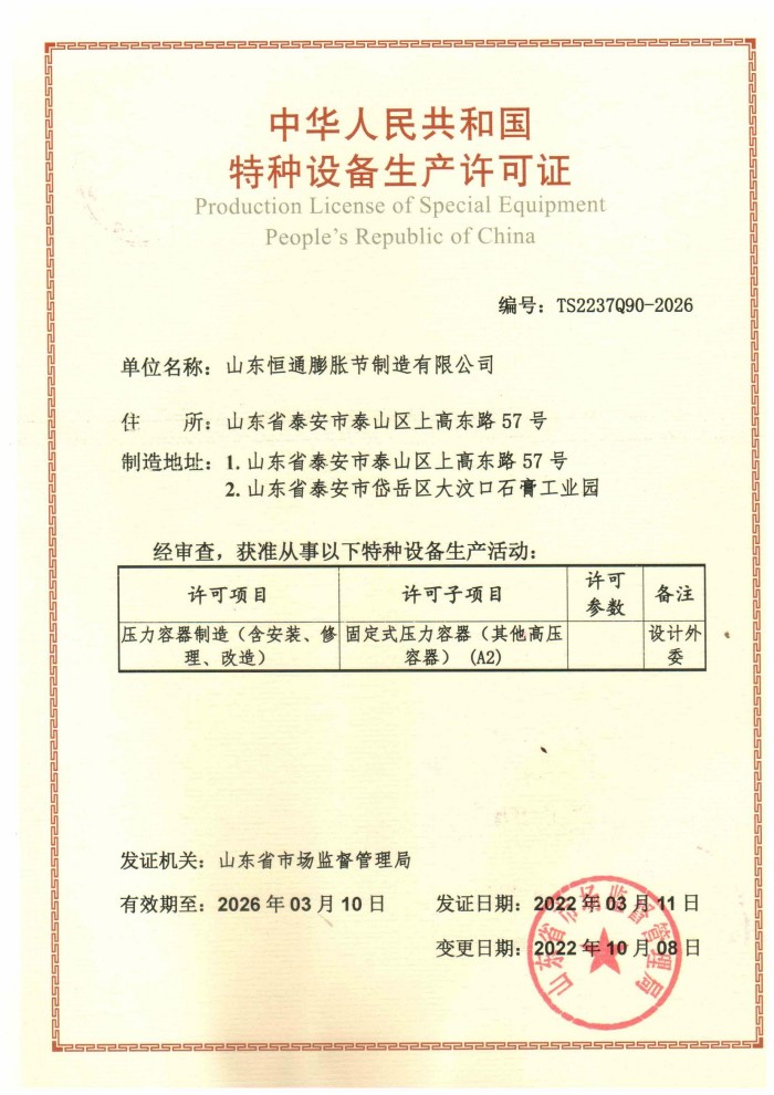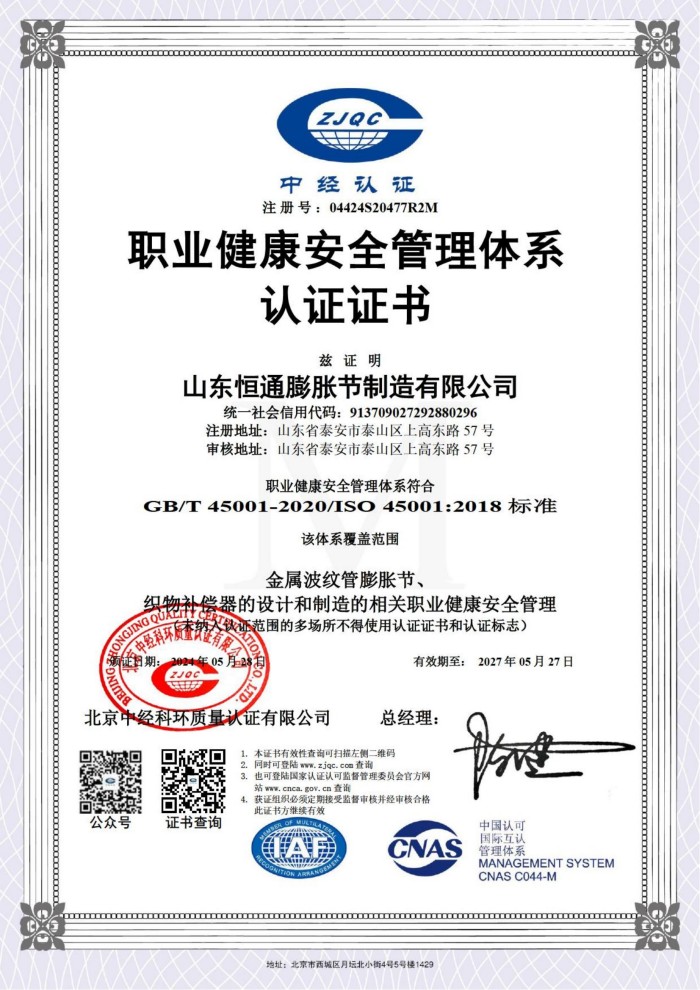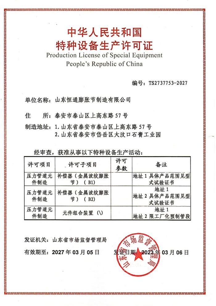 公司取得我國特種設備制造許可證、壓力容器A1級資質(zhì)、壓力管道元件A、B的資質(zhì),并且獲得了歐盟PED-CE認證、美國ASME“U”鋼印、ISO 9000質(zhì)量管理體系認證、GB/T 14000 環(huán)境管理體系認證及GB/T 45000 職業(yè)健康安全體系認證。膨脹節(jié)產(chǎn)品涵蓋壓力管道波紋膨脹節(jié)、壓力容器波形膨脹節(jié)、金屬波紋管、金屬軟管、聚四氟補償器、橡膠補償器及非金屬補償器等。
